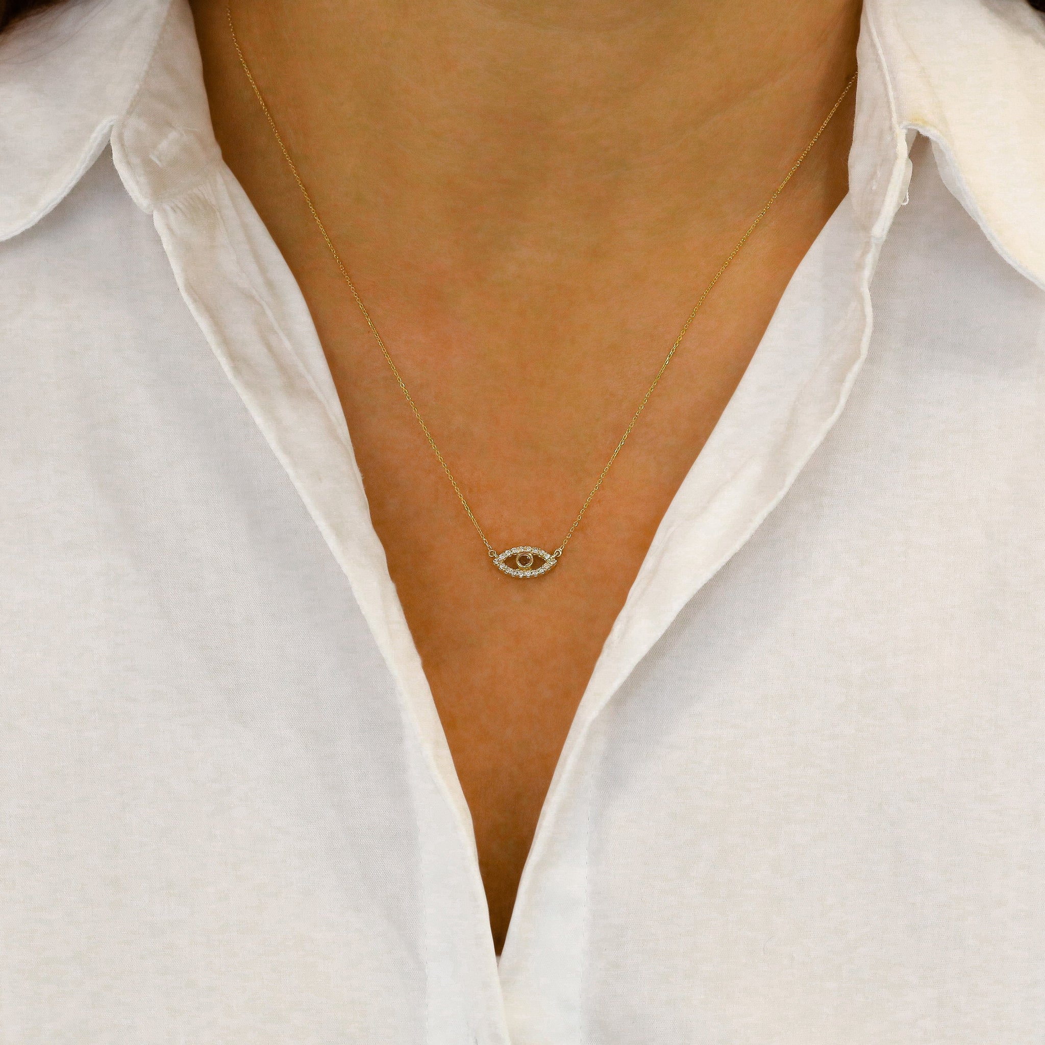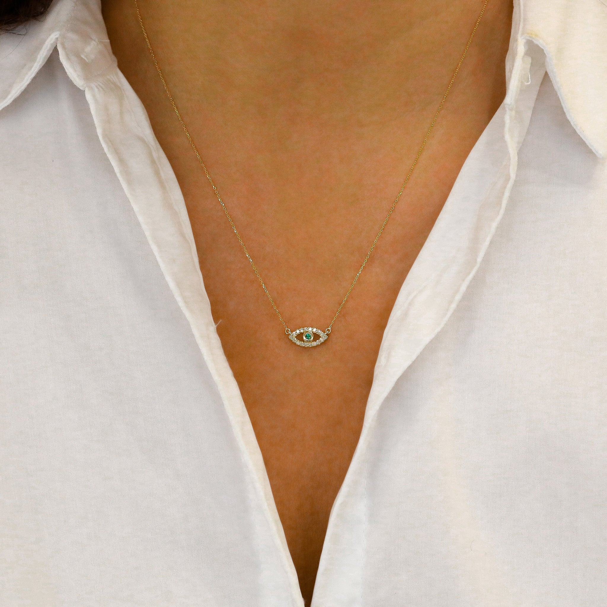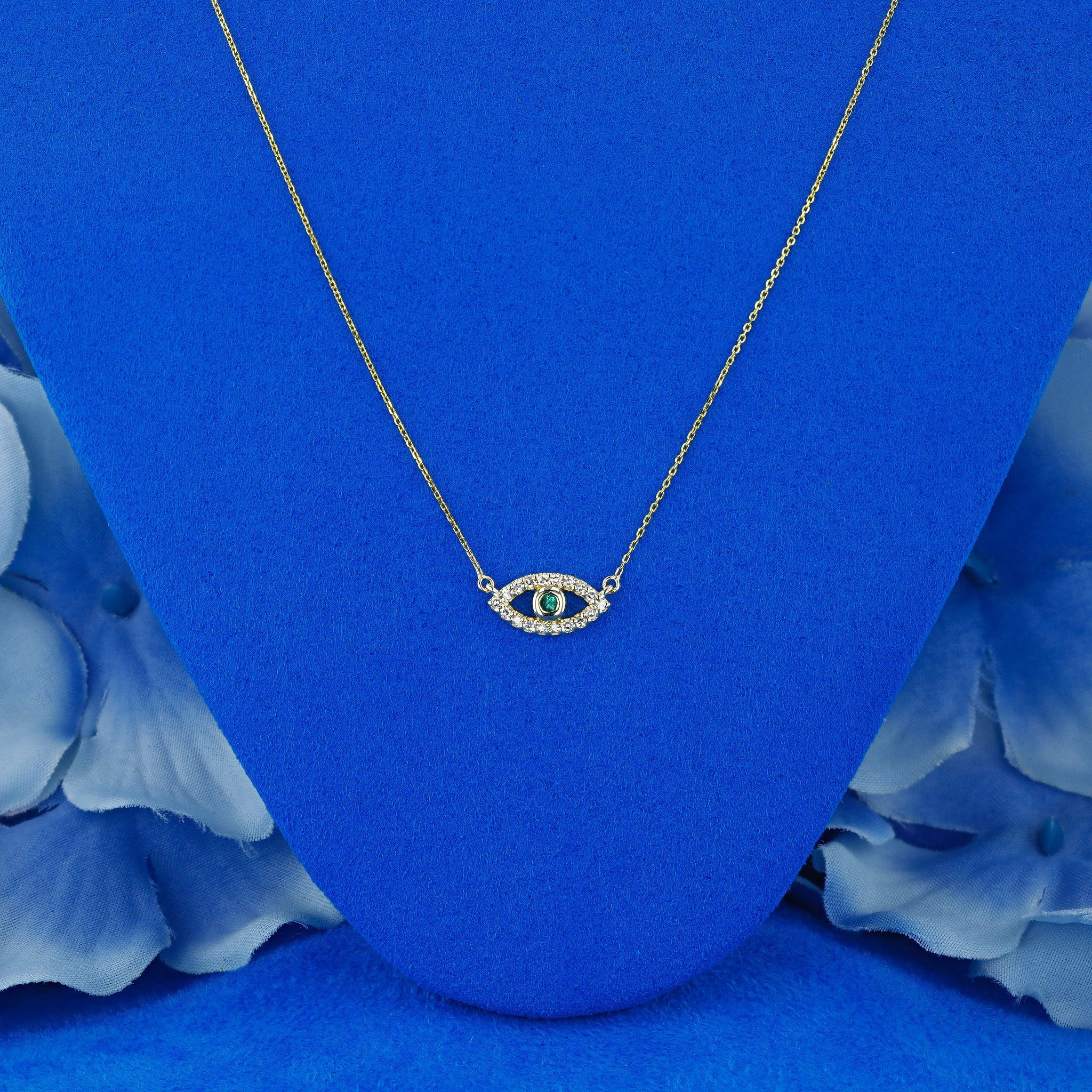 14k Solid Gold Natural Diamond with Sapphire Ruby Emerald or Turquoise Bezel Set Evil Eye Necklace w/ Adjustable Drawstring Chain