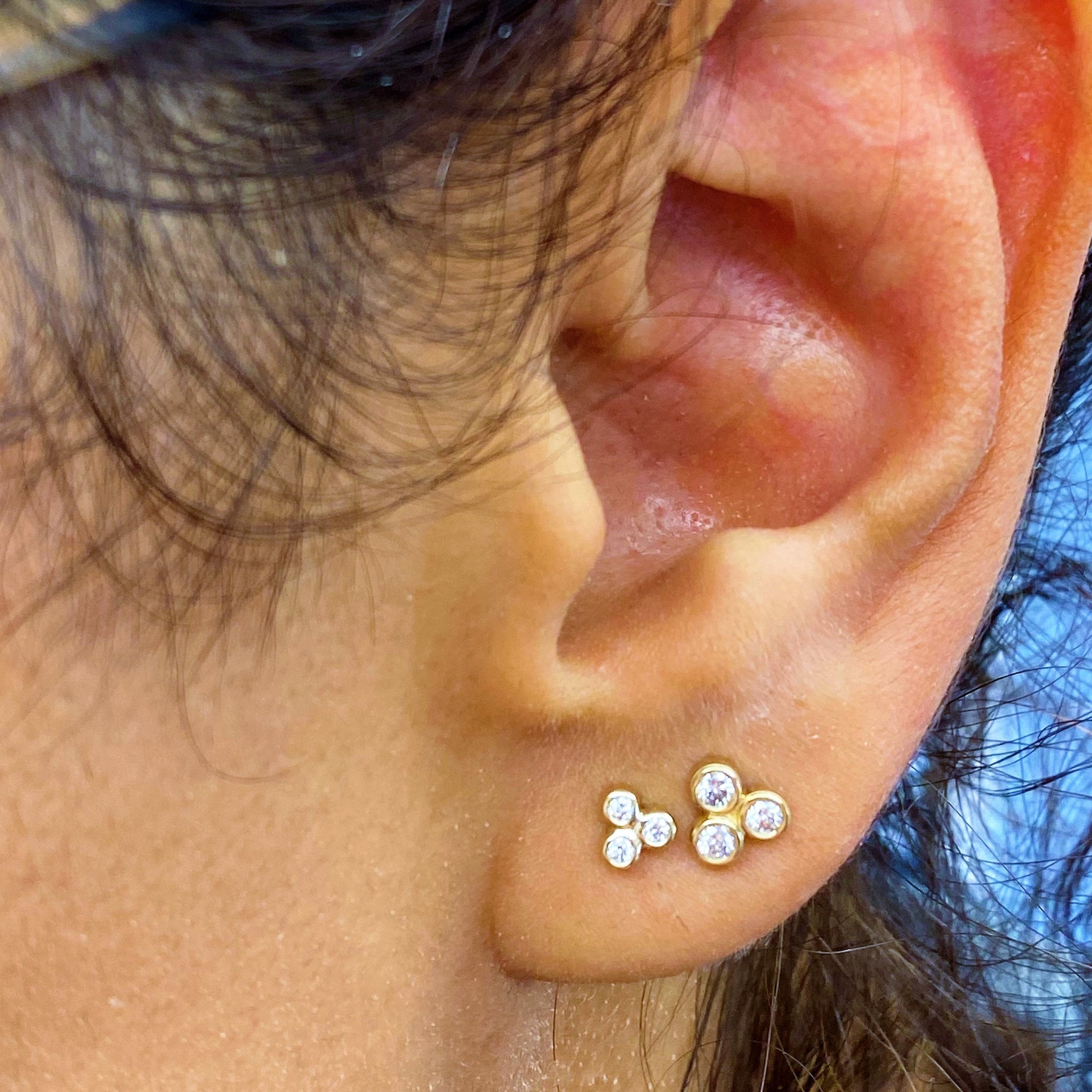 ♦ Minimalist Genuine Diamond Stud Earrings set in solid 14kt gold. Each earring consists of 3 high quality, bezel set diamonds that are guaranteed to be white, clean and sparkle.