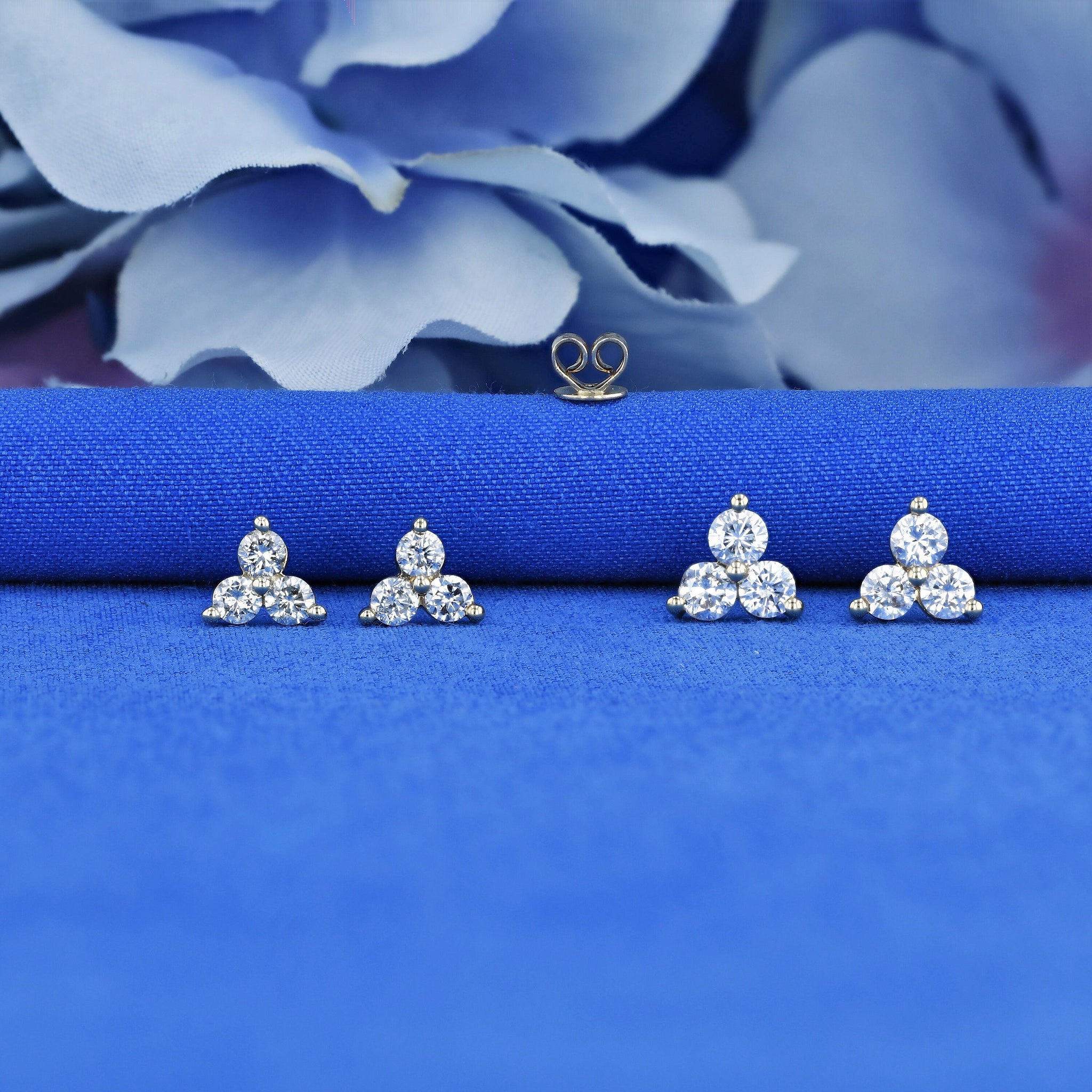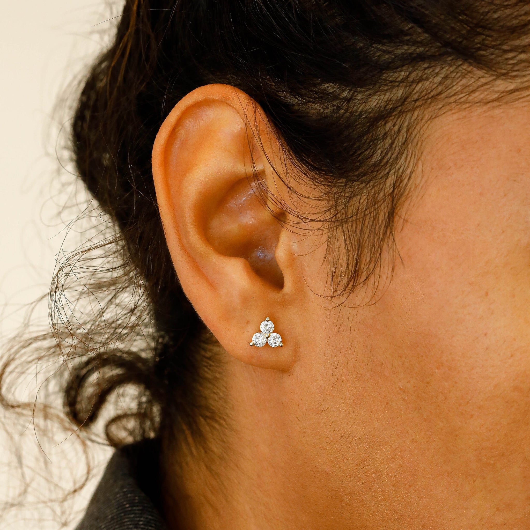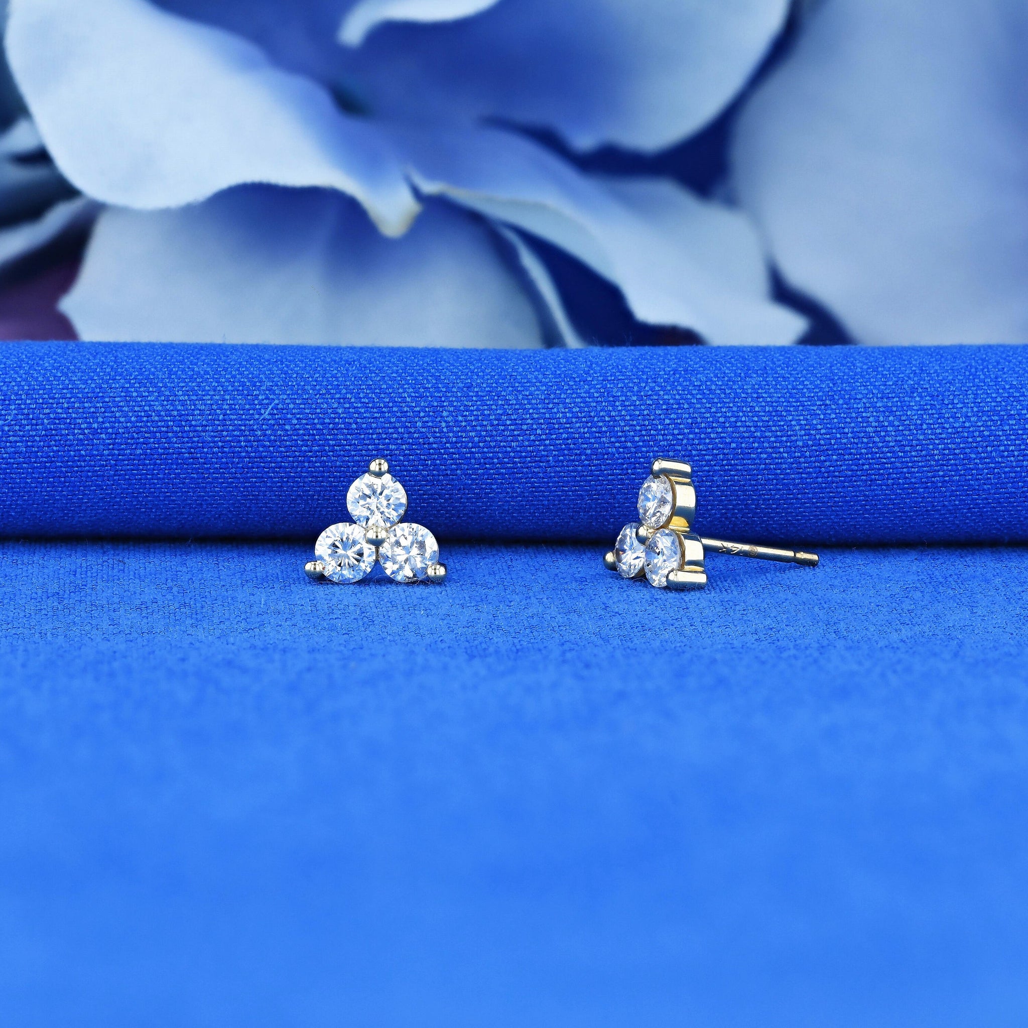 ♦ Minimalist Genuine Diamond Stud Earrings set in solid 14kt gold. Each earring consists of 3 high quality, prong set diamonds that are guaranteed to be white,