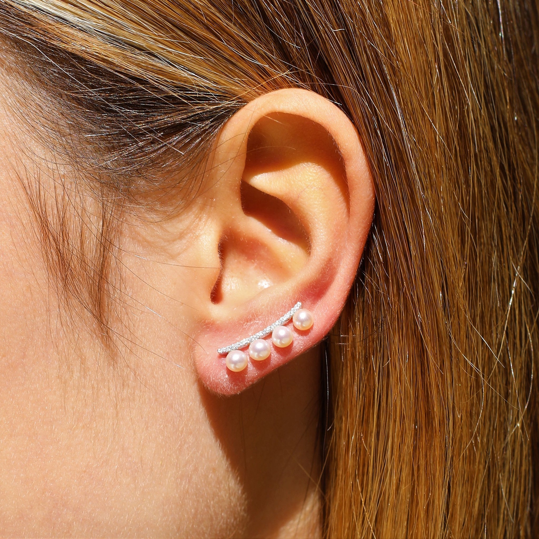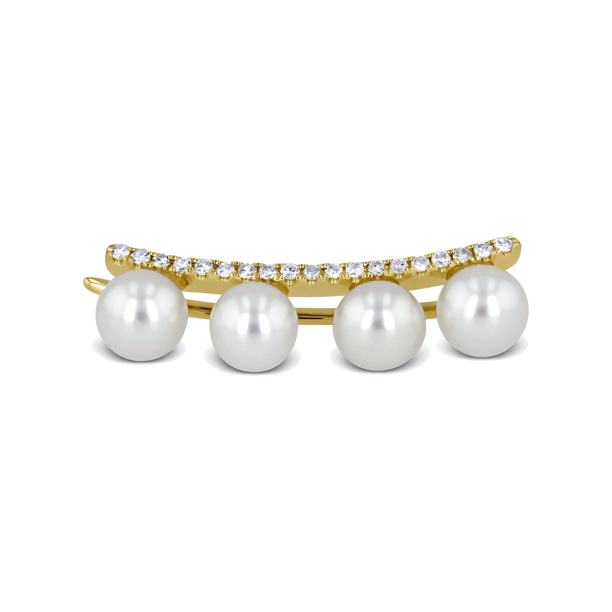 Single (Half Pair) 14k Gold Genuine Diamond + Cultured Pearl Ear Climber High Quality Earring for Women in White Yellow or Rose Gold